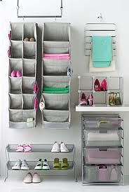 Closet accessories are made to organize. Stores like Target are good sources for these items. Depending on your closet space, there are many options to choose from; hanging or over-the-door shoe racks, belt holders, and hanging shelves are all available.