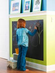 Make a family fun day at home. Purchase some blackboard paint (Benjamin Moore makes chalkboard paint), brushes, and drop cloths. Now you have a few choices. If you have a large blank wall in a family room, kitchen, kid’s room, or playroom you may opt to paint the entire wall.