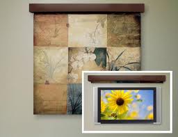 • Tapestries look beautiful on the wall and can be hung with a rod over the set so they can easily be pushed aside to reveal the TV or can be motorized to roll up above the set with a remote control. You can even have a tapestry made with a personalized photo. http://wovenartandbeyond.com