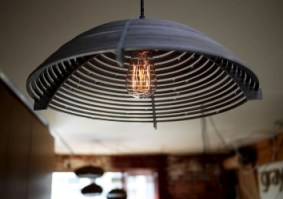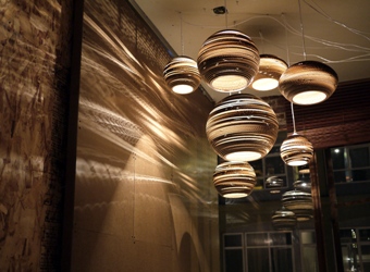 Lampshade lighting made from salvaged pieces of corrugated cardboard cut and layered into beautiful sculpture.