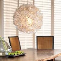 - Lighting fixtures offered include the Lotus Flower Chandelier; “artisans assemble hand-cut capiz shells, edged in metal, to create these blooming flower chandeliers that radiate like shimmering stained glass, lit from within. They come in two sizes to group or hang individually.”