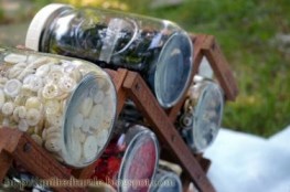 - Place jars filled with sorted buttons or nails into the slots.