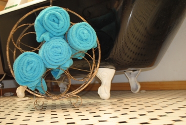 - As an alternative to a basket place a rack next to the bathtub with towels rolled for easy access.