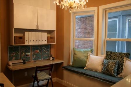 a desk space with window seat to relax and catch up on reading