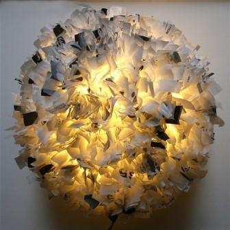 Allison hand makes each fixture and many are specifically made to order. The pendants, lamps, and sconces are crafted out of recycled materials such as pages from books and magazines, sheet music, maps, and even soda can tabs and plastic bags.