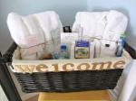 • An attractive basket is perfect to hold fresh guest towels, and bath items. Add some chocolate for a special surprise. You can use those little soaps and shampoos that you have gathered from your hotel stays. Find pretty baskets and items at the dollar store.