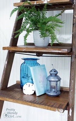 - Take the leaning ladder bookcase one step further by cutting 9 to 12 inch deep boards to fit inside the ladder on top of the steps. You can repurpose old shelves that might be waiting to be tossed. Brittany from Pretty Handy Girlgives step by step instructions.