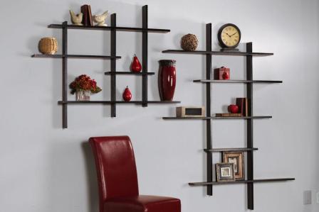 An interesting shelf can act as a wall sculpture along with be used to display objects, framed photos, and books.