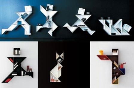 - TANGRAM, designed by Daniele Lago, is “a square in seven pieces combined with imagination to make new shapes come to life”. Mix and match colors and make your own shapes to put together a puzzle of art that is totally functional.