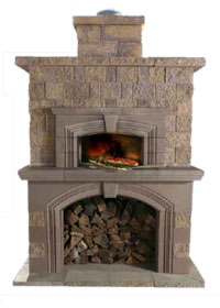 • Fireplace kits come complete with wall stones and concrete lintels, as well as a “top of the line Lennox™ stainless steel fireplace and features stainless steel curtain pull screens, a stainless steel fire grate, a 4-foot high, air-cooled chimney and black powder coated termination cap complete with galvanized flashing. Also standard are refractory brick panels inside the firebox and …polished granite tiles for the face on the front of the unit. Shipped as a wood burning unit, the fireplace can also be converted to gas.”