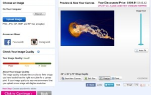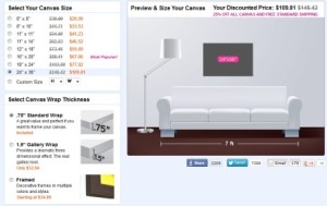 - Choose your canvas size and thickness; you can even preview the size canvas hung on a wall over a sofa.