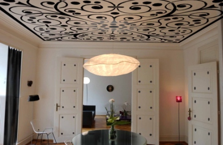 1. Hi, I love the black and white decal the shown in the picture over the table. Do you know where can I find the Black and white ceiling pattern? Thanks