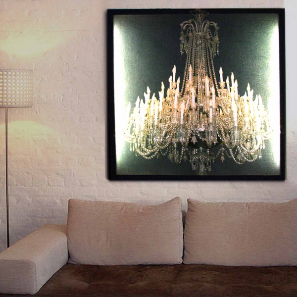 “The Glo-Canvas range was created in 2002 and launched in Milan in 2005. The range is a series of images that are digitally printed onto cotton canvas and stretched over wooden frames. Each frame is installed with low energy strip lights that illuminate the prints from within and can be hung from ceiling light fittings or mounted onto a wall.”