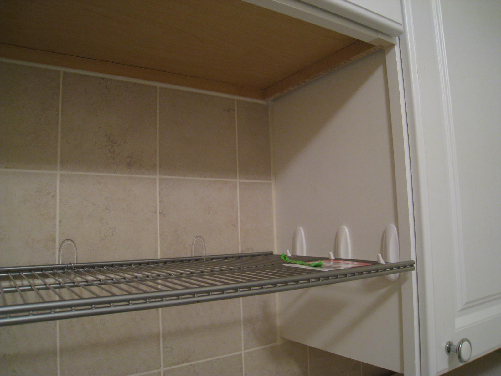By using an open metal shelf and Command hooks I easily installed a shelf myself in the niche between the two cabinets with no tools except for a tape measure, level and pencil.